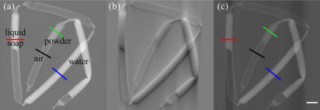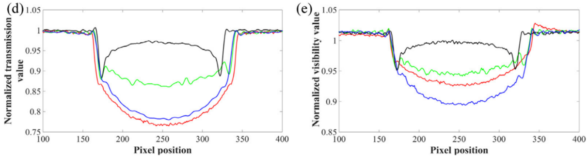 为克服相衬成像视场限制,除制作8英寸X射线吸收光栅外,还实现了硅基弯曲相位光栅。将光栅弯曲成柱面,以在一维方向上适应锥束X射线的波前,使每一束X射线只穿过一个光栅周期。利用它们构建相衬成像系统,获得了8英寸全视场莫尔条纹。进一步,为验证该相衬成像系统对X射线弱吸收物质的分辨能力,对比了样品吸收像与暗场像,样品对比度曲线可明显反映出暗场像的优势(Nucl.Instrum.Methods Phys. Res. A, 1004, 165375,2021)。展现了大视场X射线相衬成像技术对X射线弱吸收物质的无损检测能力及潜在应用。