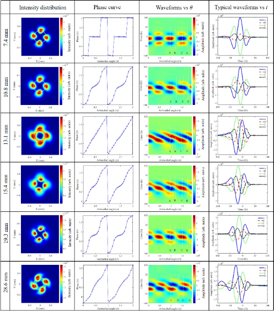 理论上首次发现通过整形双色场(基频涡旋光ω0和倍频高斯光2ω0)诱导的厘米(cm)量级长气体等离子体丝,可以产生三种不同模式的太赫兹(THz) 奇异光束(Opt. Express 29(2), 996-1010,2021),包括具有π阶跃相位分布的THz项链光束、具有非线性相位分布的THz角向加速涡旋光束和具有线性相位分布的THz涡旋光束。上述理论研究成果不仅可以加深对激光诱导气体成丝中THz奇异光束产生机制和轨道角动量(OAM)转换机制的理解,而且为实验产生及应用方面提供重要的理论支持,在THz无线通信、超分辨成像、粒子操控等领域具有潜在的应用前景。