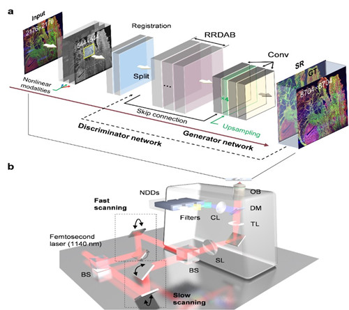 非线性光学显微镜具有高分辨率、高穿透深度、低光漂白体积等优点,可以提供丰富的结构和功能信息。然而,该成像技术成像受限于有限视场(<600 μm),很难实现大范围的细胞分布和相互作用的可视化,且难以用于临床病理诊断。近年来,随着人工智能的快速发展以及其在光学显微成像中的应用,为提高数据采集效率和图像分析提供了新的思路。其中,高分辨神经网络是最重要的深度学习图像处理技术之一,其能够在不改变光学系统的前提下克服系统的物理局限性,为高速采样的低质量问题以及高质量、大视野图像采集的时间消耗问题提供解决策略。然而,基于深度学习的图像恢复往往采用模拟噪声和高质量图像合成低分辨率图像,这种方法并不能保证适用于真实无标记图像重建,因为无标记成像通常易受热噪声和散粒噪声等噪声和扫描伪影等背景的干扰,并且具有生物样品的统计复杂性。此外,由于自发荧光/谐波光子数的稀疏性,使得无标记非线性光学显微成像难以兼顾成像速度、分辨率和信噪比等,这进一步限制了其在生物医学领域的应用。