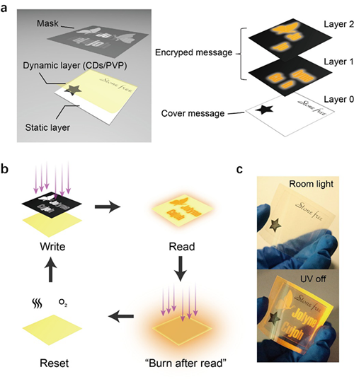在典型的动态磷光材料中,磷光体通过光动力过程消耗其所在环境中的氧气,并在氧气浓度较低时显现逐渐激活的室温磷光。对于纯有机磷光体,由于ISC效应较弱,其动态磷光的激活曲线前部表现出较高的光照剂量阈值。为解决这一问题,本工作采用了卤素掺杂的纳米碳点材料作为磷光体,提高引入卤素重原子效应增强材料的ISC效应。结果显示,碳点产生三重激发态的效率随卤素掺杂量增加而显著提升、随之引起磷光效率的增长和激活阈值的降低。通过将碳点与聚乙烯基吡咯烷酮高分子材料(PVP)复合,课题组进一步制备了柔性、透明的低激活阈值动态磷光薄膜,并通过掩模加工得到了磷光强度和寿命连续变化的一系列灰阶动态磷光图案。在此基础上,通过结合磷光寿命成像(PLIM)和相图分析(Phasorplot)完成了对动态磷光薄膜所记录多级灰阶图形信息的快速分离解密,还基于材料的动态发光特性,实现了高度私密的阅后即焚功能。
