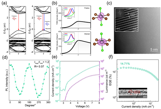 图1.(a)拉伸应变下CsPbBr2Cl导带粘合形成准简并状态并组成双极化跃迁通道;(b)显著增强的光学吸收和跃迁偶极矩;(c)钙钛矿的TEM图样;(d)带边极化跃迁的偏振选择性;(e)器件的电流-电压关系曲线;(f)器件EQE效率。