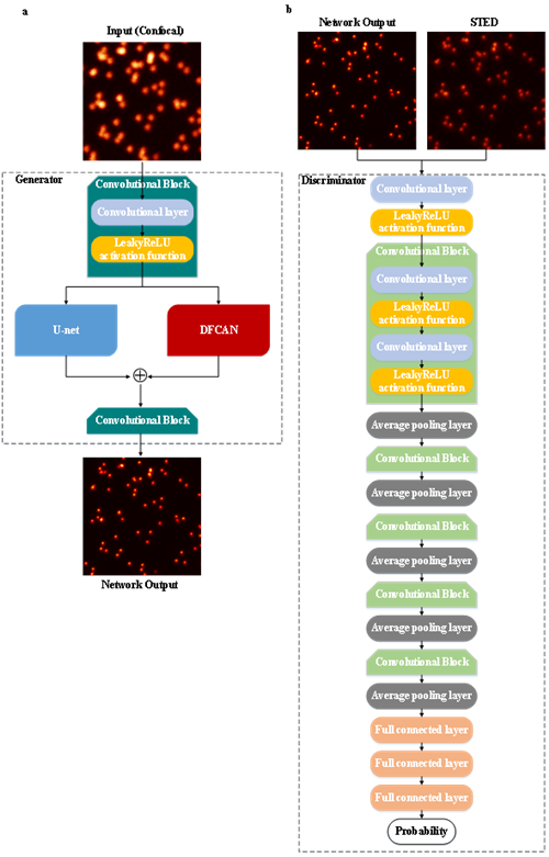传统超分辨荧光显微成像技术受限于特殊的荧光团、复杂的光学系统、较长的采集时间和计算处理时间,以及成像过程中的光损伤和光漂白,阻碍了超分辨荧光显微技术在长期活细胞成像中的广泛应用。为了克服这些限制,需要开发新的方法,提高图像分辨率的同时又可以最小化其缺点,课题组构建生成对抗式网络结构通过学习空域和频域中的信息表示来实现图像分辨率增强,该方法既不需要特殊的仪器设备也不需要特殊的荧光团,而且不限制图像的像素大小和成像模式。
