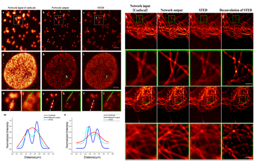 图2. 对荧光珠、细胞核和微管三种不同结构进行图像分辨率增强,共聚焦图像作输入,网络输出超分辨图像,受激发射损耗超分辨图像作对比。