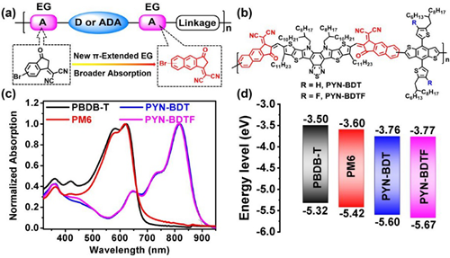 课题组与美国西北大学研究团队合作,报道了两种新的多聚小分子受体PYN-BDT和PYN-BDTF,凭借其π-延伸萘环作为宽光学截面的大分子吸收剂,可用于所有聚合物太阳能电池(APSC)。其中与PBDB-T共混制备的APSC的转换效率最高可达13.22%,特别是其短路电流Jsc=22.28 mA /cm2,该数值是已知的APSC最高值之一。