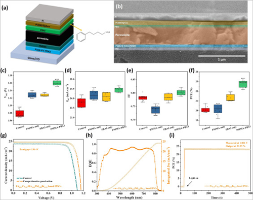 课题组通过钝化钙钛矿活性层的表面和底部晶界,有效解决了界面高密度陷阱倒置的复合损耗,可以将未封装的反型钙钛矿太阳能电池转换效率提高至23.33%,具有显著的长期稳定性,这一效率接近国际同类型器件的最高转换效率。此外,本工作还提供了一种新颖的载流子缺陷分析技术,通过协同分析电容-电压和驱动级电容剖面,能有效恩熙界面陷阱密度和离子累积密度的分布,为降低钙钛矿太阳能电池的陷阱密度和抑制界面离子积累提供了直接证据。