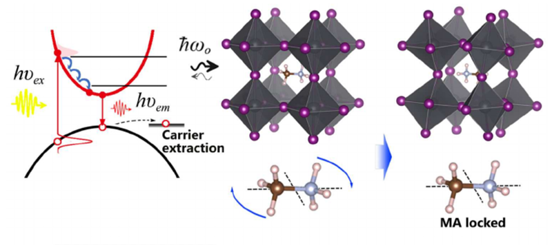 课题组与英国塞瑞大学研究者合作,将荧光显微成像和荧光寿命成像用于研究钙钛矿太阳能电池的强光响应行为,首次观察到的一种可恢复的激光诱导荧光猝灭现象,并发现这种现象具有微观晶粒尺度限制,并伴随着光谱变化。这种荧光猝灭取决于俄歇复合主导条件下的激光强度和停留时间。该研究结果为通过调节钙钛矿晶格排列和捕获高能载流子来改进器件性能提供了技术支撑。