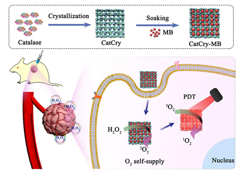 在肿瘤治疗领域,肿瘤缺氧大大限制光动力学治疗肿瘤的效率。目前,主要的解决策略为,选择合适的载体,递送产生氧气的功能分子和光敏剂,从而缓解肿瘤缺氧,提高光动力学治疗肿瘤效率。在本研究中,泰梅石教授课题组提出,直接利用过氧化氢酶晶体负载光敏剂,提高光动力学治疗肿瘤效率。过氧化氢酶晶体具有优异的稳定性,可以高效持续催化肿瘤内过量的H2O2产生O2,缓解肿瘤缺氧。同时,过氧化氢酶晶体三维有序的多孔结构作为递送系统,负载光敏剂,避免光敏剂的聚集,进一步提高了光动力学治疗效率。总之,过氧化氢酶晶体同时作为功能材料和药物递送系统,大大简化了抗癌药物的合成流程,有利于临床转化,并且拓展了蛋白质晶体的新应用。