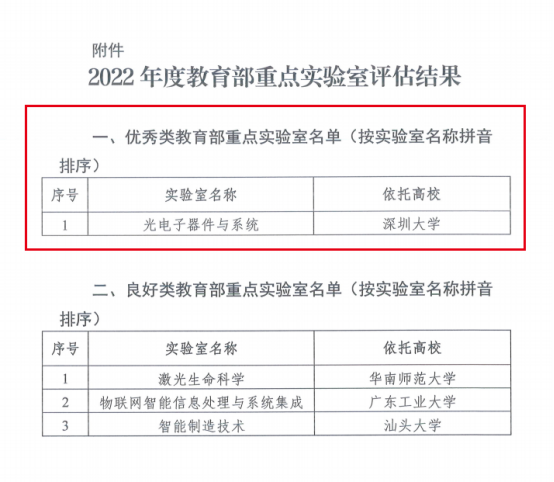 近日,教育部科学技术与信息化司公布了2022年度教育部重点实验室(信息科学领域)评估结果,我院“光电子器件与系统教育部重点实验室”评估为优秀,是广东省唯一获评优秀的信息领域教育部重点实验室,也是教育部重点实验室成立20年来第一次获评优秀。重点实验室在2022年度广东省重点实验室评估中也获得优秀。