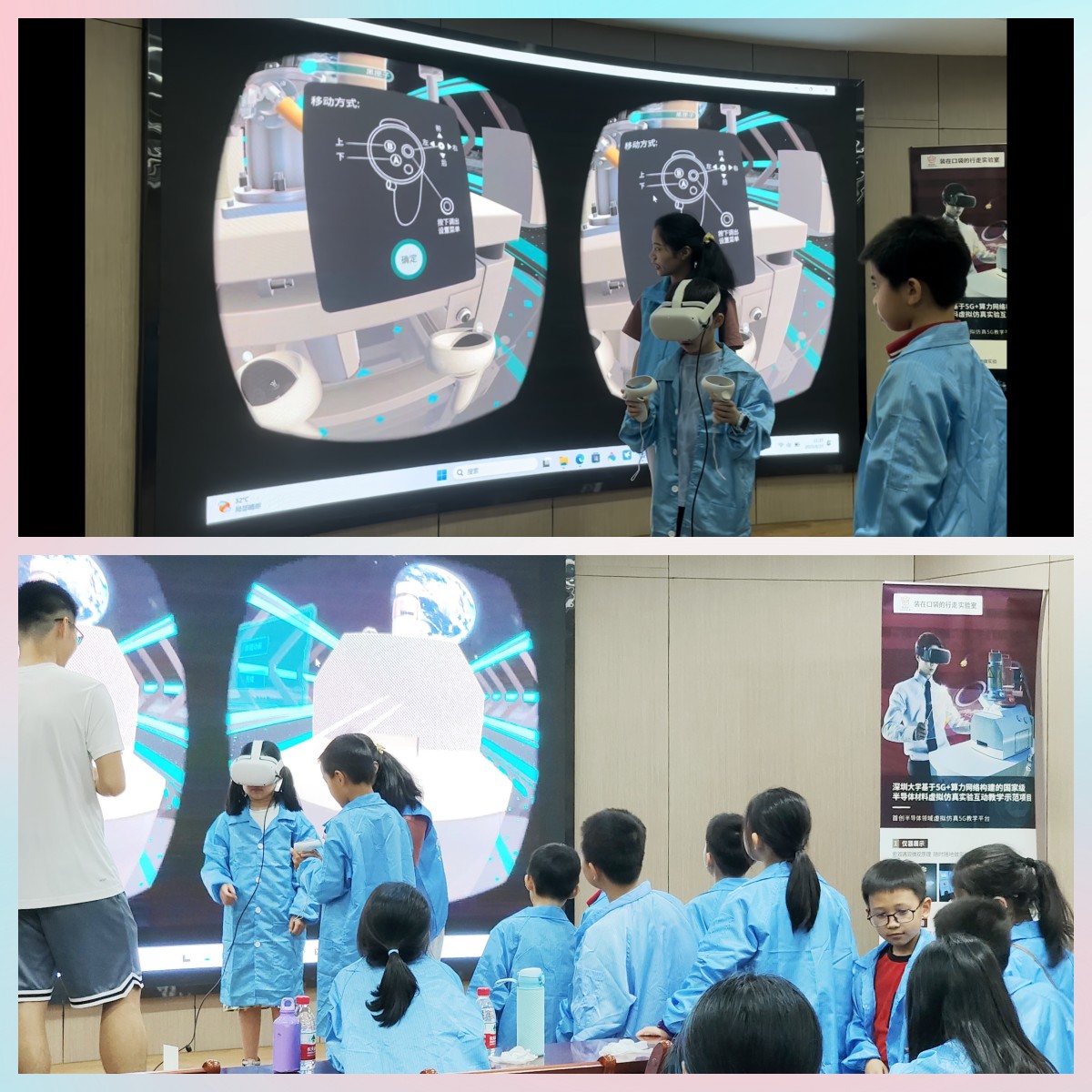 参观完实验室后,小朋友们还一一体验了神秘有趣的VR元宇宙世界。这是由我们光电教学实验中心开发的元宇宙实验室,在里面可以做科学实验游戏、了解实验仪器结构、参观工厂、体验灭火等安全培训游戏,也就是传说中的“装在口袋里的实验室”。