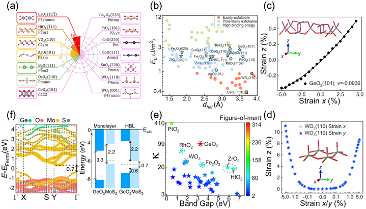 图1. (a, b)二维介电氧化物的结构和剥离能;(c, d)二维GeO2和WO3的负泊松效应;(e)介电常数和带隙分布;(f)GeO2/MoS2异质结能带及带边位置。
