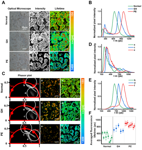 此外,为实现早期诊断,在孕12周收集了42例慢性高血压的血清样本,经标记和荧光寿命成像后,成功地将子痫前期患者与慢性高血压孕妇区分。使用超高效液相色谱法对孕妇血清进行非靶向脂质组学进行验证,证实荧光寿命成像技术在子痫前期疾病诊断上的有效性和精确性。
