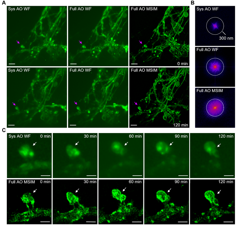 图2. 活体斑马鱼运动神经元结构变化动态监测。(A)像差校正以及多焦点结构光照明对成像的提升效果对比。比例尺:5微米。(B)频域分布图中量化像差校正和超分辨重构对成像分辨率的改善。(C)A图中紫色箭头所指结构的时间序列成像结果。比例尺:2微米。