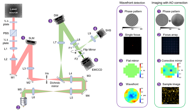 图1. 基于自适应光学校正的双光子多焦点结构光照明显微成像系统示意图。L1-L9:透镜。F1和F2:滤光片。Flip mirror:翻转镜,可在超分辨成像和波前探测模式之间切换。波前探测模式:1. 液晶空间光调制器(Spatial light modulator,SLM)上加载相位图;2. 对应生成单个激发点;3. 变形镜(Deformable mirror,DM)上加载平面镜电压面型;4. 夏克哈特曼波前传感器(Shack–Hartmann wavefront sensor,SHS)探测波前像差。像差校正后的超分辨成像模式:1. SLM上加载多焦点激发光阵列的相位图和像差校正相位图;2. 对应生成像差校正后的多焦点激发光阵列;3. DM上加载像差校正电压面型;4. 经过像差校正的超分辨图像。