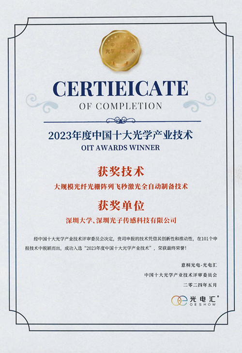 5月18日举行的2023年度中国十大光学产业技术颁奖典礼暨产业创新大会上,深圳大学王义平教授团队和深圳光子传感科技有限公司联合研发的“大规模光纤光栅阵列飞秒激光全自动制备技术”从101个申报项目中脱颖而出,荣膺2023年度中国十大光学产业技术奖。