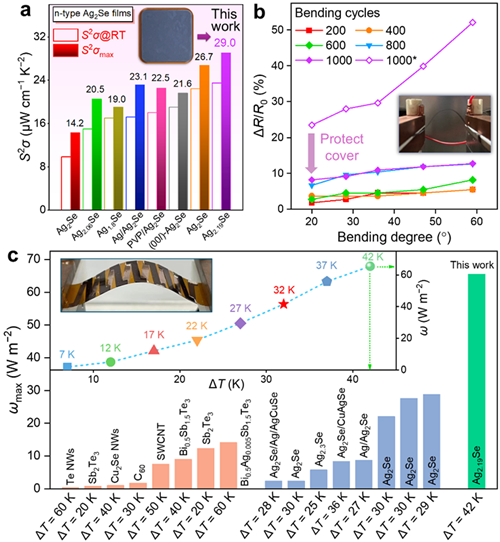 针对该难题,研究团队首先专注于进一步提高Ag2Se薄膜的热电性能并增强其柔性,基于这些高性能、柔性薄膜优化器件的设计,最后拓宽了薄膜器件应用场景。通过Se蒸气与Ag前驱体薄膜在固气相中的扩散反应,我们在柔性PI基底上的Ag前驱体薄膜制备了Ag2Se薄膜,通过优化工艺获得了(013)择优取向的Ag2Se薄膜。最终在363 K时实现接近30 μW cm−1 K−2的功率因子(在室温下为23 μW cm−1 K−2)。基于此,我们设计了一种由聚乙酸月桂酯组成的高柔性有机复合保护层,显著提高了薄膜的柔性,同时不降低其热电性能。此外,基于器件应用场景,我们合理设计了柔性器件,在42 K的温差(ΔT)下其输出功率密度(ω)高达65 W m−2,超过目前报道的同类型柔性热电器件。