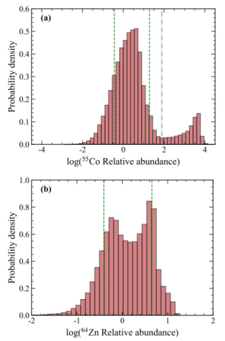 图1:⁵⁵Co与⁶⁴Zn丰度分布呈现多峰结构。绿色虚线表示68%置信区间。