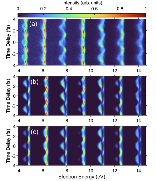 图1. He原子体系阿秒联合光场延迟依赖的 (a) 实验测量,(b) TDSE,(c) SFA光电子谱。