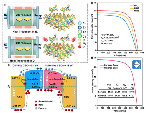 异质结气氛热处理及铜锌锡硫原子排列示意图(a);能带构型示意图(b);铜锌锡硫薄膜太阳电池效率曲线-实验室测试(c);铜锌锡硫薄膜太阳电池效率曲线-官方认证测试(d) 文章链接:https://doi.org/10.1038/s41560-025-01756-2