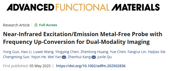 (1)题为“Near-infrared excitation/emission metal-free probe with frequency up-conversion for dual-modality imaging”的研究论文在Advanced Functional Materials上发表,并被列为“Hot Topic: Carbon, Graphite, and Graphene”热点领域。设计并制备了一种具有频率上转换,近红外激发和发射特性的探针用于多模态成像。郭勇博士后和扬州大学李灏助理研究员为该论文第一作者,严伟副教授(深圳大学)和康振辉教授(苏州大学)为该论文的通讯作者,深圳大学为第一完成单位和通讯作者单位。