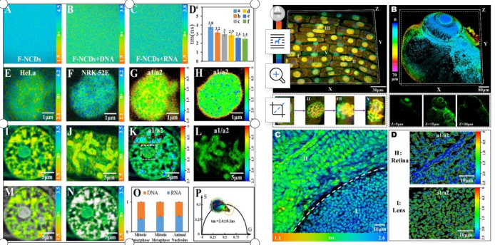 可视化活细胞中核酸(DNA和RNA)的形态和动力学是了解它们在调节生物体生长、发育和繁殖中如何发挥作用的关键。然而,目前缺乏能够同时靶向DNA和RNA的有效探针,以及分析它们在生物体中的分布和相对比例的工具。因此,本研究成功制备一种具有双光子吸收的氟-氮共掺杂碳点(F-NCDs),该F-NCDs表现出稳定的荧光、良好的生物相容性和对核酸(DNA和RNA)敏感的荧光寿命。以F-NCDs为探针结合双光子荧光寿命成像技术(TP-FLIM)的多色成像能力来定量区分DNA和RNA在细胞核中的分布情况。该方法可以有效追踪不同分裂阶段植物细胞核(洋葱根尖)中DNA/RNA分布的变化和区分动物组织(斑马鱼)的细胞种类。