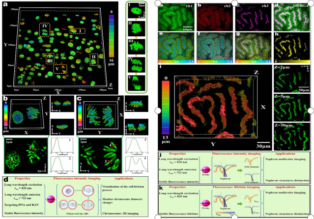 本研究通过元素掺杂与共轭结构调控,成功制备了具有频率上转换发光(FUCL)特性的氮掺杂碳点(N-CDs)。该N-CDs基于单光子吸收机制,在723 nm处呈现稳定近红外发射,兼具优异的光稳定性(光漂白抗性强)、高信噪比(自发荧光干扰低)及良好的生物相容性。其扩展的π共轭结构赋予了对核酸的特异性识别能力。基于自主搭建的多模态成像系统,N-CDs成功应用于:1)通过荧光强度成像实现植物细胞(洋葱根尖)有丝分裂过程的动态示踪和染色体形态学定性分析;2)通过荧光强度/寿命成像技术对哺乳动物组织(小鼠肾脏)进行双模态成像,可清晰区分近曲小管(PCT)等精细结构;3)利用荧光强度成像技术实现对在活体小鼠皮下血管成像和血液流速的测量。该研究为开发新一代多功能生物探针提供了重要理论基础,对推动生物医学成像和精准医学发展具有重要价值。